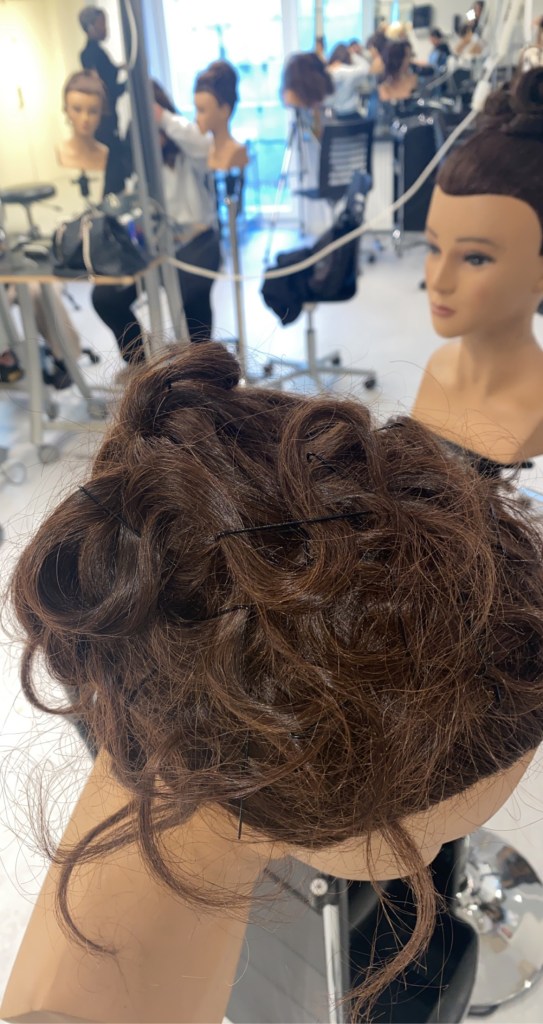 Idag lavede vi denne flotte frisure. Vi startede med og lave en stramt hestehale, også krøllede vi små totter. Derefter lavede vi dem som slanger og puttede hårnåle i for og gøre dem helt stramme😁